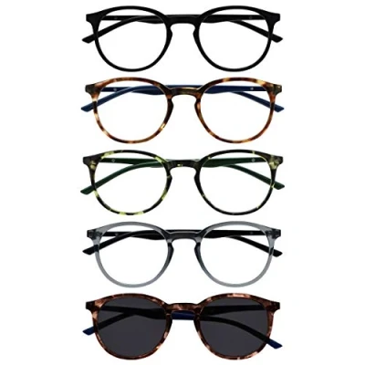 OPULIZE Met 5 Pack Reading Glasses with Sunglasses Round Black Brown Green Grey Mens Womens RRRRS60 12672 +1.00