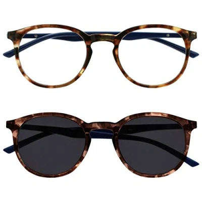 Super stylish large size men's / women's / unisex reading glasses with reading sunglasses twin pack. Reading glasses for indoors / normal reading conditions with a matching pair of reading sunglasses for reading in the sun (UV400 protection, blocks UVA and UVB rays). Sturdy round frame design with spring hinges. Easy to clean. Scratch-resistant. Comfort fit. Includes FREE designer style pouch. Brown Tortoiseshelll front with navy blue arms. Strength +2.00.