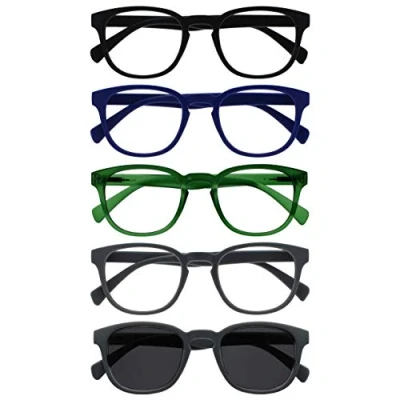 OPULIZE Pop 5 Pack Reading Glasses With Sun Reader Retro Round Black Blue Green Grey Mens Womens RRRRS2 13677 +1.50