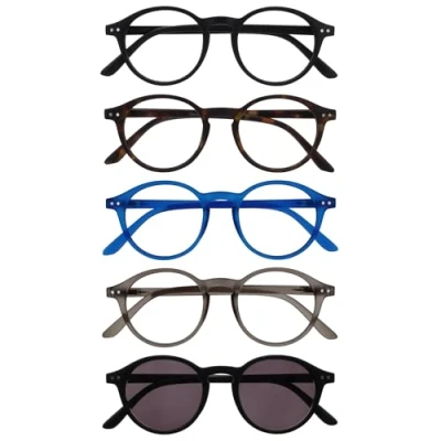 OPULIZE REY Readers with Reading Sunglasses 5 Pack Round Frame Matt Black, Brown, Blue, Grey, Black Mens Womens Spring Hinges RRRRS56 12371 +3.50