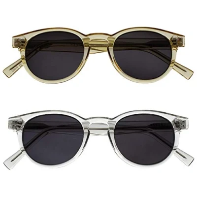 Two pairs of super stylish women's / men's / unisex reading sunglasses. One pair in transparent gold finish and one pair in shiny clear finish. Glasses for reading in the sun. UV400 protection, blocks UVA and UVB rays. Sturdy round frame design with metal hinges. Easy to clean. Scratch-resistant. Comfort fit. Includes FREE designer style pouch. Strength +2.50.