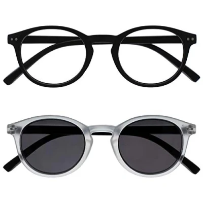 Lightweight small size men's / women's / unisex reading glasses with reading sunglasses 2 pack. Reading glasses in smooth matt black finish. Reading sunglasses in matt clear crystal front with matt black arms for reading in the sun (UV400 protection, blocks UVA and UVB rays). Sturdy round timeless frame design with spring hinges. Easy to clean. Scratch-resistant. Comfort fit. Strength +1.00.