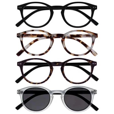 Lightweight small size men's / women's / unisex reading glasses with reading sunglasses 4 pack. Reading glasses in smooth matt black finish, matt light brown Tortoiseshelll finish and dark brown Tortoiseshelll with black arms. One pair of reading sunglasses in matt clear crystal front with matt black arms for reading in the sun (UV400 protection, blocks UVA and UVB rays). Sturdy round timeless frame design with spring hinges. Easy to clean. Scratch-resistant. Comfort fit. Strength +2.00.