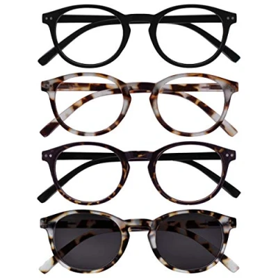 Lightweight small size men's / women's / unisex reading glasses with reading sunglasses 4 pack. Reading glasses in smooth matt black finish, matt light brown Tortoiseshelll finish and dark brown Tortoiseshelll with black arms. One pair of reading sunglasses in matt light brown Tortoiseshelll finish for reading in the sun (UV400 protection, blocks UVA and UVB rays). Sturdy round timeless frame design with spring hinges. Easy to clean. Scratch-resistant. Comfort fit. Strength +1.50.