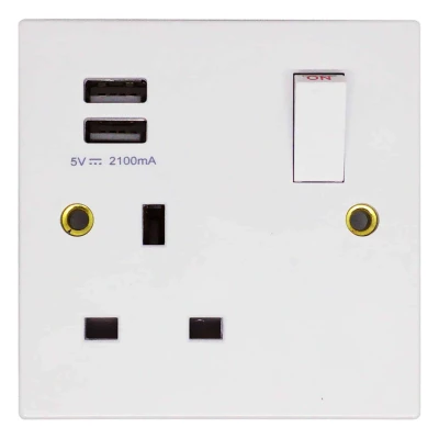 Simply LEDSquare edged 1-gang 13 Amp white wall socket has 2 x USB charging ports (2100mA) and is perfect for charging up your phones, tablets and other electrical devicesSuitable for domestic and commercial use.