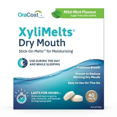 LONG-LASTING DRY MOUTH RELIEF: XyliMelts Stick-On Melts are oral discs that adhere to teeth or gums to temporarily relieve dry mouth symptoms for 4-8 hours. Perfect for daytime use, but especially suitable for night when saliva flow is at its lowest NIGHTTIME FRIENDLY: Use while sleeping to prevent dry mouth disturbing sleep BREATH FRESHINING: The subtle mint flavor gently freshens breath while moisturizing your mouth. NATURALLY SUGAR-FREE: Our dry mouth tablets are made with Xylitol, a natural sugar-free sweetener that helps boost saliva flow for dry mouth relief. May prevent the risk of new tooth decay. INNOVATIVE ORAL CARE SOLUTIONS: OraCoat XyliMelts are an easy-to-use, on-the-go solution that coats, moisturizes and lubricates your mouth even while sleeping. The blister packaging is great for travel and everyday relief