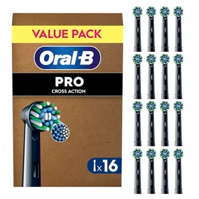 Easy Delivery:16 counts of Oral-B Pro Cross Action Black toothbrush head in a mailbox compatible packaging Removes up to 100% more bacterial plaque for cleaner teeth and healthier gums vs. a manual toothbrush Only genuine Oral-B brush heads feature X-shape bristles that clean in areas that regular ones cannot reach for optimal cleaning efficacy Oral-B Cross Action features unique 16° angled bristles to perfectly adapt to each tooth for deep cleaning Guaranteed fit with Oral-B electric rechargeable toothbrushes except Pulsonic & iO toothbrushes