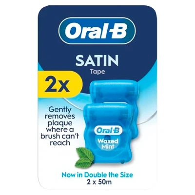 Oral-B Satin Tape helps maintain dental hygiene and cleans between teeth Waxed interdental floss with a satin-like texture and mint flavour Ensures you get to hard-to-reach places to remove more plaque Floss like a pro: 50m roll of tooth floss for easy and efficient dental care