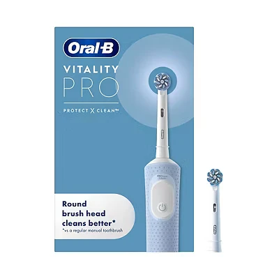 Oral-B Vitality Pro Rechargeable Electric Toothbrush with 2 Brush Heads, Blue This rechargeable electric toothbrush is designed to support effective everyday oral care compared to a regular manual toothbrush. It features Oral-B’s oscillating and rotating cleaning action to help remove plaque more efficiently while remaining gentle on gums. The toothbrush offers three brushing modes – Daily Clean, Sensitive, and Sensitive Plus – allowing you to adjust your brushing experience based on comfort and need. An integrated timer helps guide brushing for the recommended two-minute duration. Features: Oscillating and rotating 2D cleaning action for enhanced plaque removal compared to a manual toothbrush Three brushing modes for personalised cleaning comfort Sensitive Plus mode designed for extra-gentle brushing Built-in timer to support consistent brushing duration Round brush head design to clean each tooth individually Compatible with a wide range of Oral-B replacement brush heads