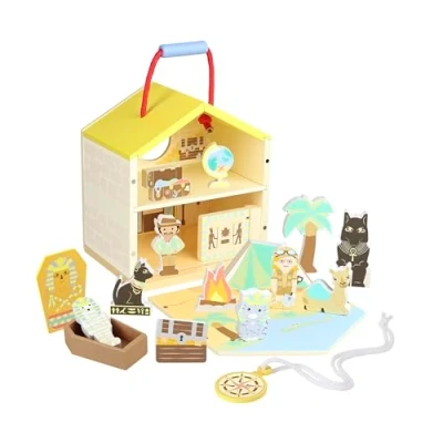 AmazonCOMPLETE SET: Wooden playset includes adventurers, camel, mummy, treasure chest, compass, map, and various Egyptian-themed accessories for immersive play INTERACTIVE DESIGN: Features a magnetic front panel that reveals a desert oasis scene, perfect for creative storytelling and exploration PORTABLE SIZE: Compact dimensions of 20 x 19 x 16.5 centimetres make it ideal for travel and storage, with a convenient carrying handle EDUCATIONAL VALUE: Encourages imaginative play whilst learning about exploration, map reading, and ancient Egyptian themes PLAY FEATURES: Includes unfolding paper map and compass for treasure hunting adventures, plus detailed wooden figures and scenic backdrops, Manufacturer: Orange Tree Toys
