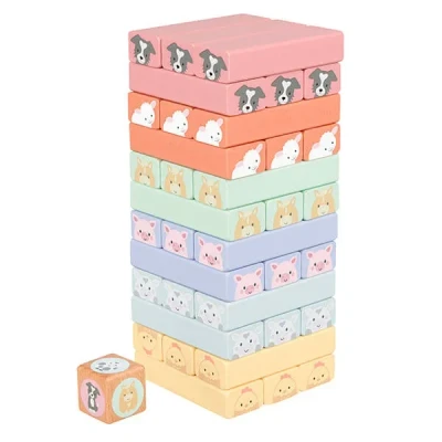 The Orange Tree Toys Farmyard Animal Wooden Tumbling Tower is an engaging game designed for one or more players. This interactive tower-building game challenges players to stack blocks in sets of three. Roll the dice, and strategically remove the block matching the colour and adorable farmyard animal. The anticipation builds until the tower inevitably tumbles!Not just a game, these vibrant blocks double as building blocks for endless creative possibilities. Construct unique structures or create domino chains for added excitement. Ideal for fostering hand-eye coordination, colour recognition, and dexterity in young ones.Crafted from sustainable wood, this Tumbling Tower is eco-friendly and completely plastic-free. Plus, it comes with a convenient canvas bag for storage.Recommended for ages 3 and up, this versatile game promises hours of entertainment while promoting essential developmental skills.