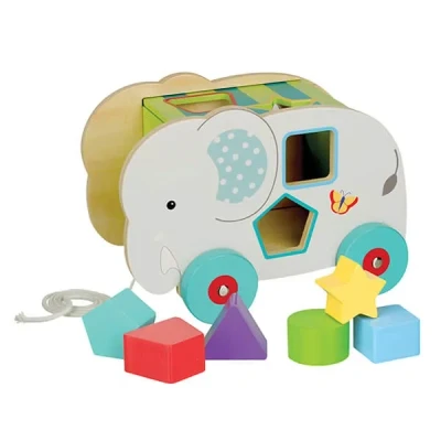 The Orange Tree Toys Jungle Elephant Sorter features 6 chunky shapes in bright colours for fitting into an elephant shape sorter.This toy is great for teaching children shape and colour recognition. The elephant also has a set of wheels and can be used as a pull along toy, encouraging children to take those important first steps.Made from sustainable wood which supports responsible management of world forests. Suitable for children 18 months and over.