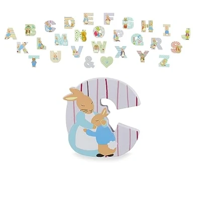 PERSONALISED BABY WITH OFFICIAL LICENSED PETER RABBIT TOYS: A beautiful wooden letter C featuring Peter Rabbit and Mrs Rabbit, with each letter featuring a different Beatrix Potter character and pattern. ABC animal wooden letters are the perfect addition to any little ones nursery or children's bedroom. Create a personalised toy box, cupboard door, a coat peg or simply to decorate a wall with a child's name or use them to teach their ABCs SAFE FOR NURSERY: Our wooden alphabet letters are painted in beautiful pastel colours with non toxic paint and make the perfect nursery and bedroom accessories. All Orange Tree toys are tested both in-house during production and independently to meet European safety standards. Wooden letters are approximately 7 x 7 x 1cms PROMOTES DEVELOPMENT: Make learning fun with Beatrix Potter alphabet letters! Our wooden letters support letter and animal recognition skills; with a variety of colours, characters and shapes, perfect to help stimulate a baby’s visual senses. Enjoy lovable wooden letters with Beatrix Potter letters and Orange Tree Toys! TRUSTED MANUFACTURER: Designed in the UK by Orange Tree Toys, in their headquarters in the Cotswold countryside. Orange Tree toys are environmentally friendly; made from sustainable wood and 100% recyclable packaging. Wooden toys are durable and long lasting; providing hours of fun and play value for children, they can be passed down the generations! PETER RABBIT GIFTS: Perfect Beatrix Potter baby gifts, with Beatrix Potter's famous creation crafted into wooden letters for children's names; they make wonderful 1st birthday gifts for girls and boys, Peter Rabbit Christmas presents, Christening gifts or for another special occasion. Animal theme wooden letters are ideal boys or girls bedroom accessories, wall decor for nursery decoration or children's bedroom