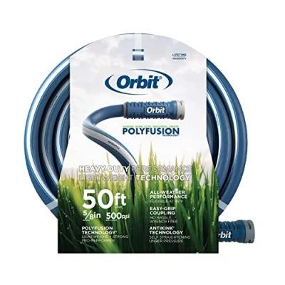 ENJOY EFFICIENT WATERING - The Orbit Polyfusion Garden Hose features advanced technologies that make watering tasks a breeze - perfect for gardens, homes, jobsites, auto and industrial settings. DURABLE AND FLEXIBLE - Engineered with Polyfusion Technology, this heavy-duty water hose combines the strength of premium polymers with the lightweight feel and maneuverability of a flexible garden hose. MINIMAL KINKING - With Antikink Technology construction, this kink-free hose self-straightens under pressure, minimizing kinks and ensuring a continuous flow of water. ABRASION RESISTANT - The Orbit Polyfusion water hose looks and feels like rubber while being highly resistant to abrasions, ensuring its longevity and durability EASY INSTALLATION - The wrench-free anodized aluminum crush-resistant couplings with easy-grip collars at both ends make installation a breeze, saving you time and effort., Weight: 7.6 Pounds, Manufacturer: Orbit