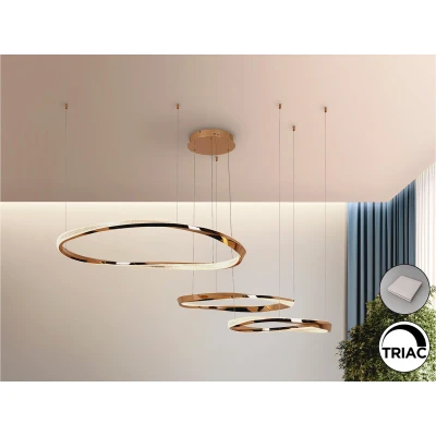 Net LightingLamp of 3 ring (Ø55, Ø70, Ø85 cm), made of steel and aluminum, shiny gold plated finish. Clear faceted acrylic diffuser. Adjustable in height. 120W LED, 8.400 lm, 3.000K. Dimmable. Includes TRIAC driver and dimming SET.