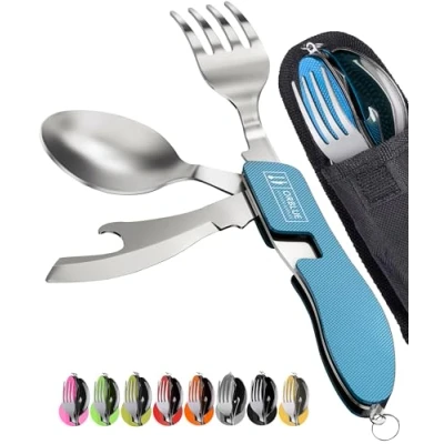 ORBLUE 4 in 1 Camping Cutlery Set 2 Pack Stainless Steel Foldable Spoon Fork Knife Bottle Opener with Pouch Portable Travel & Utensils for Hiking Outdoor Use Blue