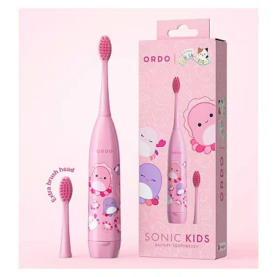 The Ordo Squishmallows Kids Battery Powered Toothbrush features gentle sonic cleaning with 18,000 pulses per minute, fun Squishmallows character designs, and soft bristles, making brushing enjoyable and effective for children aged 4 and above. It includes two brush heads, a long-lasting battery, and interactive prompts for thorough oral care.