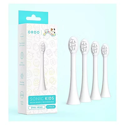 JoybuyThe Ordo Sonic Kids Rechargeable Brush Heads (White, 4 Pack) are slim, soft-bristled replacements designed for gentle, effective cleaning—perfect for daily use, including around braces. Compatible with Ordo Sonic Kids Rechargeable Toothbrushes featuring Squishmallows Cam, Patty, and Samir.