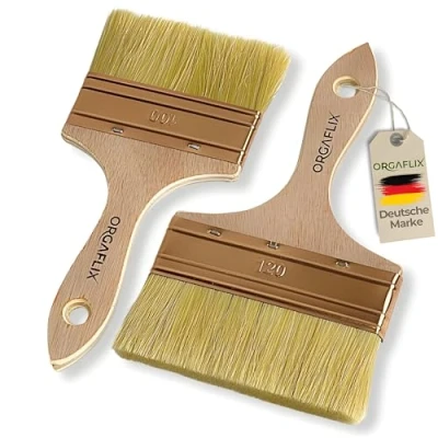 Efficient for saving: the innovative surface brush set from ORGAFLIX is an indispensable brush set for the discerning DIY enthusiast to the painter professional. The high-quality light bristle mix with 90% tops ensures the finest and streak-free painted surfaces. Thanks to the width of 100 and 120 mm, large areas can be optimally processed in no time. Perfect use: dense and dimensionally stable mixed bristles with high colour absorption and even release, ensure best results as well as precise results in professional quality. The handy, unpainted natural wood handle sits optimally in the hand and promotes a pleasant and fatigue-free working method. Versatile use: the wide brushes are ideal for all water-based and slightly solvent-based paints such as stains, varnishes, oil, varnishes, acrylic paints. Optimal use on all surfaces such as wood, metal, plastic as well as parquet floors, furniture, doors, fences, patios, stairs, carports and much more. Easy to clean: To ensure a long service life and multiple use, it is recommended to wash the brushes before and after use, simply with lukewarm water and soap and then gently squeeze out until all loose fibres or paint media have dissolved. Our promise: we are convinced by our quality promise. Grab and gas.