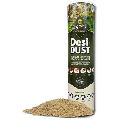 ORGAN-X Desi-DUST Entrapment Powder Ultimate Moisture Removal Powder for the natural promotion of a healthy environment. Desi-Dust is a natural organic (diatomaceous earth) entrapment powder; made up of tiny fossilised silica diatoms. Natural silica has many uses. Absorbing moisture, fats and oils; Aids in plant growth and development; Anti-caking feed additive are but a few. Desi-Dust can be applied on and around pets and animals (avoid contact with eyes), including their bedding, litter areas, cracks and crevices. The natural silica absorbs any moisture, reduces odour and bacteria breeding grounds, resulting in clean dry areas where insects find it impossible to develop. Animal productivity is increased due to comfortable surroundings. Desi-Dust can be applied to plants, their leaves and surrounding soil. Silica is naturally abundant in plants, aids growth and development, but also prevents ideal breeding conditions for crawling insects. Desi-Dust can be liberally applied in and around the home, including in the garden when weather is dry.