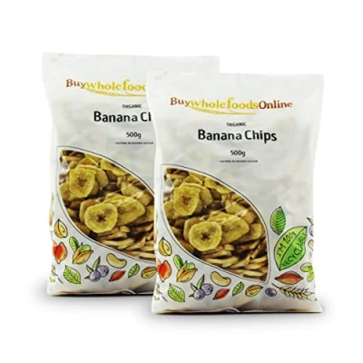 Dried organic banana chips are a great natural confectionery that can be enjoyed as a guilt-free snack to curb a sweet tooth. Our tasty sweet organic banana chips have been fried in coconut oil before the drying process to provide a subtle coconut flavour. BuyWholefoodsOnline is not owned by or affiliated with Amazon or Whole Foods Market Try teaming your organic banana chips with various other dried fruits, nuts and seeds for a healthy trail mix This product is now 100% Recyclable