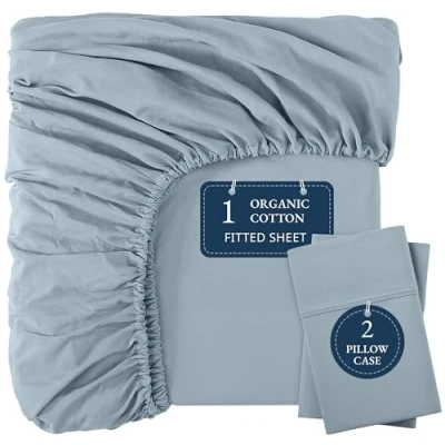 Organic Cotton King Fitted Sheet Ultra Soft & Breathable with 2 Pillow Covers, 35cm Deep Pocket, Elastic Edges Bottom French Blue