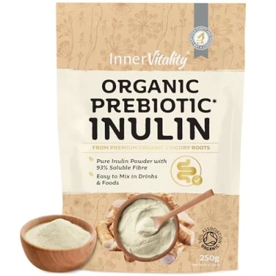 WHY ORGANIC INULIN? A natural way to increase your prebiotic soluble fibre to help support beneficial gut bacteria, digestion & overall gut health. Inulin powder is the most researched backed prebiotics for gut health, making it ideal as a fibre supplement. 33% of Your Daily Fibre in One Serving - Just one 10g serving provides 33% of your recommended daily fibre intake, making it an easy way to boost fibre levels and support healthy digestion. Our premium Inulin is certified organic and pure & natural with zero additives. Sourced from organic chicory root. Easy to Mix & Versatile - Dissolves easily in hot or cold drinks and can be added to tea, coffee, yoghurt, porridge & recipes to boost the fibre without needing fibre supplements in large capsules. Low GI & Naturally Sweet - Inulin is a low glycemic index fibre, meaning it has minimal impact on blood sugar levels while offering a naturally mild sweetness, perfect for tea, coffee, or baking. Inner Vitality is a family-owned UK company with a mission to help people support their health to Move, Feel & Look their best with natural science-backed foods. Our products are made and certified in the UK to the highest BRC, GMP & ISO manufacturing standards.