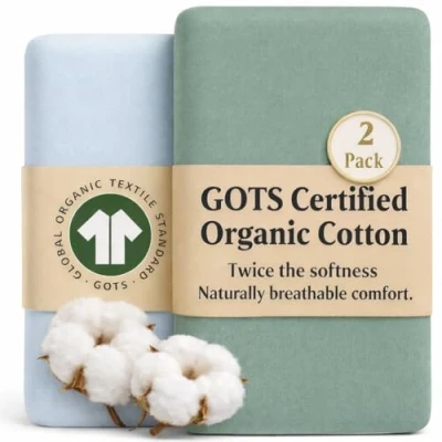 TOUCH IT · FEEL IT · COMPARE You’ll notice the difference instantly. Most baby sheets look fine online, but in real life they’re shockingly thin almost see-through which means your baby is lying directly against the synthetic mattress or protector underneath. Thin sheets trap heat, feel plasticky, and offer no comfort layer during the 14 - 16 hours a day babies spend sleeping. That’s why thickness and breathability matter far more than most parents realise. Bunnyjik sheets are crafted from luxuriously thick 200gsm organic Turkish cotton, creating a truly soft, breathable comfort layer noticeably thicker than typical baby sheets sold today. SIZE : Size: Set of 2 next to me crib sheets Compatible with many other bedside cribs / cots. Compatible with many bedisde cribs, It will fit any matresses by 51x85cm / 50x90cm / 83 x 50 cm. CERTIFIED ORGANIC COTTON : We use only GOTS certified organic cotton, Licence No. 1139680 — verifiable at global-standard.org. the world’s most trusted standard for organic textiles. No pesticides. No synthetics. No harsh dyes. Pure from farm to finish. WHY WE MADE THIS ; Plush, substantial organic cotton that cocoons your baby’s skin in softness. Naturally breathable and absorbent, thick enough to wick moisture away for calm, undisturbed sleep. SLIGHTLY OVERSIZED FOR A PERFECT FI : This next to me sheets cut with a little extra room to allow gentle, natural shrinkage after the first wash. Once washed and tumble dried, the sheets settle into their true size and reveal a luxuriously soft, cloud like feel. BEYOND ORDINARY COZIER. THICKER. SOFTER : These sheets for next to me crib Made from 200gsm double knit organic cotton, almost twice as thick as standard crib sheets. Designed for long lasting softness, durability, and comfort. MEET THE MAKERS : Responsibly crafted in Turkey using Turkish cotton prized for its long, silky fibers that create an exceptionally soft yet durable weave. Each sheet is made with care, integrity, and generations of craftsmanship.