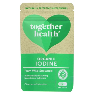 TOGETHER HEALTH Organic Seaweed Iodine provides natural iodine from sustainably harvested Ascophyllum seaweed, with added co-nutrients for optimal thyroid, cognitive, and energy support. Certified organic, vegan, and lab-tested for purity, each capsule delivers 195% NRV of iodine; suitable for those seeking a pure, whole-food iodine supplement.