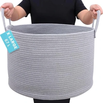 Cotton Natural Hand-Woven Basket the Joanna is the Extra Large XXL storage hamper you will love to use. This is the perfect addition for your little kid’s nursery room Attractive Multi-Tone basket blends well with your decor and personal taste. This is much nicer than the many plain all white decorative laundry baskets that stain easily. You will be proud to feature this stylish round woven basket in your home and even taking it with you to the laundry or for bathroom storage. Available in two sizes, Tall and Wide. Natural handmade cotton rope has no plastics, harsh chemicals, toxins, or harmful additives. It is the natural renewable material you feel good about having in your home. Soft and safe for kids. Big easy-carry handles make these blanket storage baskets the most portable. Compare to others with small handles that need both hands to carry or hurt you. Durable and Long Lasting to give you a great laundry storage basket that will last for years of continuous use. Rope will not separate, fray, or fall apart like wicker, wire or jute. We use highest grade materials and construction. You can feel and see the impressive difference the moment you receive it. Many people are stocking these extra large baskets to organize baby toy rooms, dog toys, crafts supplies, classroom decor, living room and store lots of items. HURRY AND BUY NOW while we have this attractive handmade basket in plentiful supply. It makes a thoughtful birthday gift, holiday gift, wedding present, or housewarming gift - great for anyone who appreciates a premium hand woven rope basket!