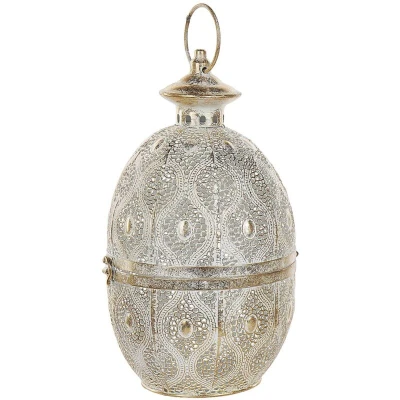 AmazonMetal openwork lantern in a form of an egg, inspired by oriental style Painted in gold, with a fashionable distressed effect An elegant accessory for a boho living room or dining room Can be hung thanks to the carrying handle Glass candle holder included in the set