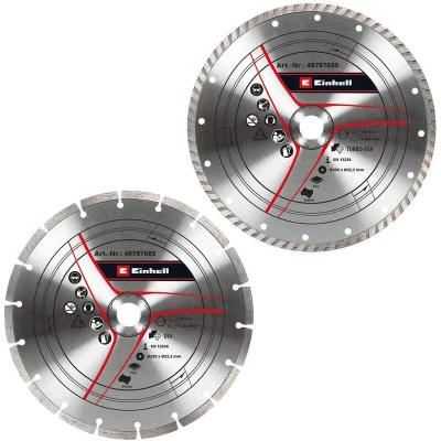 General description Original Einhell 2-piece 230 mm diamond cutting disc set designed for use with angle grinders. This set includes two types of cutting discs: one with a turbo edge and another with a segmented edge, both optimized for various cutting tasks. Technical specifications Disc diameter: Ø 230 mm Disc thickness: 1.8 mm Bore diameter: 22 mm Maximum revolutions per minute: 6,600 min^-1 Circumferential speed: 80 m/s Compatibility and accessories Compatible with angle grinders with Ø 230 mm Specifically compatible with Einhell angle grinder TE-AG 230 Specifically compatible with Einhell angle grinder TE-AG 230/2000 Usage Suitable for cutting tiles or travertine Ideal for higher cutting performance in materials such as granite or concrete