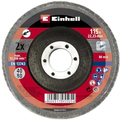 Angle Grinder Accessories - The original Einhell flap discs 115 mm are a suitable accessory or replacement part for the Einhell angle grinders. FITS - The blade grinding wheels fit various manufacturers angle grinders with disc diameter 115mm and 22.23mm bore. USE - The flap disc set is ideal for smoothing welds, rust removal of metal, sanding paints and varnishes, sanding work on metal. Grit - One sanding mop disc each with grain size P40 and P80. This means that an optimal grinding pattern can be achieved for both coarser and finer grinding work. Box contents: the set contains 2 flap discs that have a circumference speed of 80 m/s and up to max. 13,300 revolutions per minute., Manufacturer: kwb by Einhell