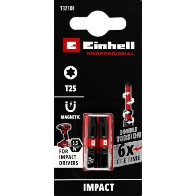Original Einhell Impact Bits with Double Torsion, 2 Pieces, 30 mm, T25 (S2 Steel, High Durability, Torsion Effect, Red Colour Ring, C 6.3 Shank)