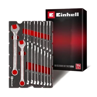 E-Case System–Pad fits the E-Case S-F and allows individual combination with two EVA pads. 12-Point Profile–The ring end with 12-point design allows powerful tightening and loosening even under high torque. Chrome Vanadium Steel–Manufactured to DIN 3113 for strength and durability under heavy use. Satin Finish–Provides a non-slip grip and secure handling even with oily hands. 19 Sizes 6–27 mm–Covers all common fastening jobs indoors and outdoors. Organized Storage–EVA pad with carbon look keeps each spanner securely in place. Versatile Use–Ideal for assembly, maintenance, and mechanic work on bicycles, furniture, and garden tools., Weight: 6.172943336 pounds, Manufacturer: Einhell Accessories