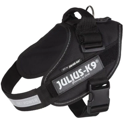 Julius-K9 IDC Power Nylon Harness, size 0/M-L (58-76 cm). Ergonomic and robust, it offers a soft and breathable interior. Adjustable by straps, with lamp holder and handle. Ideal for dogs, black color.