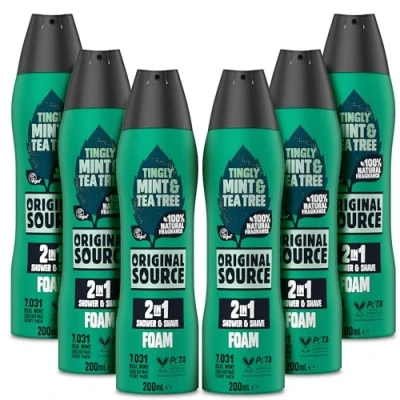 Original Source Mint & Tea Tree 2 in 1 Shower and Shave Foam (Pack of 6)100 Percent Natural Fragrance Vegan, Cruelty Free, Paraben FreeBulk Buy, 6 x 200ml