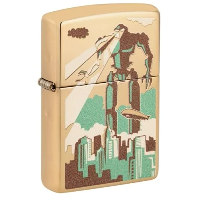 Futuristic robot design: a detailed motif that shows a robot in the dynamic environment of a city. POLISHED BRASS FINISH - The lighter shines in a shiny gold tone that symbolises elegance and durability. Unmatched Zippo quality: enjoy legendary reliability and unique Zippo click security. WINDPROOF DESIGN A reliable flame in all weather conditions, ideal for the urban adventurer. REFILLABLE FOR LIFETIME USE - Environmentally friendly and economical, backed by Zippo's Lifetime Warranty. IDEAL GIFT FOR TECHNOLOGY AND DESIGN LOVERS A must-have for fans of futuristic design and urban culture. COLLECTIBLE - An exceptional addition to any Zippo collection.