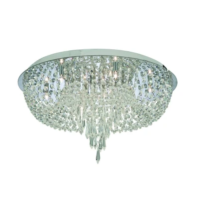 The chrome 10 light semi-flush ceiling fitting with crystal trimmings makes an elegant centrepiece for any bedroom, living room, dining room or kitchen. The ten halogen lights are nestled within an intricate arrangement of crystal trimmings that hang gracefully from above. This stylish fitting looks beautiful by day and absolutely stunning by night.