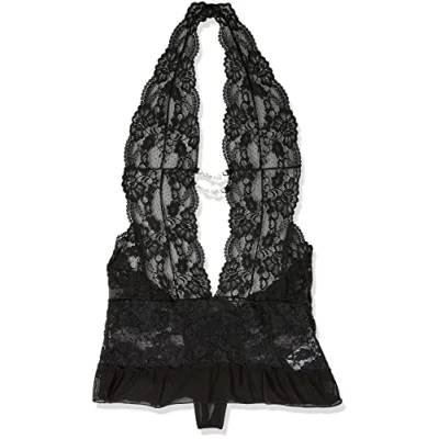 Includes a sewn-on crotchless string Very low-cut neckline with 2 decorative chains Completely backless Made out of delicate floral lace