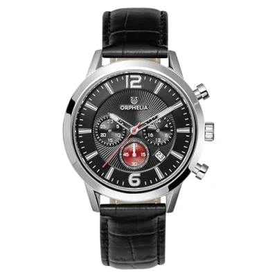 Amazon MarketplaceSPECIAL EDITION: Orphelia Tempo Chronograph watch with a Miyota Japanese Quartz movement includes a Date display and is designed in rich leather with red topstictching. This watch features a Stopwatch, a 24 hour display and Luminous Hands. Wear it daily as a polished yet functional finish PREMIUM QUALITY: By using high-quality materials, Glass: Mineral Glass, Case material: Stainless steel, Bracelet material: Crocodile-embossed Leather- Water resistant: 5 bars COMPACT SIZE: Case diameter: 43 mm, Height: 10 mm, Bracelet- Length: 23 cm, Width: 19 mm. Due to this practical handy size, the watch is absolutely for everyday use-Weight: 62 g NOBLE COLOUR: The classic colours will go great with any outfit . It enables you to easily spice up a normal outfit and add style to your life- Case Colour: Silver, Dial Color: Black, Band Color: Black COMPLETE PACKAGE : The watch is delivered in a Beautiful Orphelia Giftbox and has a 2 years warranty