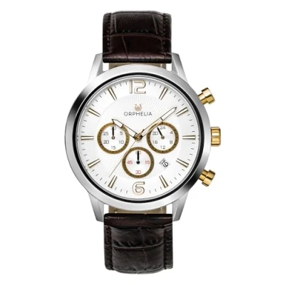 AmazonGREAT DESIGN: Orphelia Tempo Chronograph watch with a Miyota Japanese Quartz movement includes a Date display. This watch features a Stopwatch, a 24 hour display and Luminous Hands. Wear this speacial designed watch daily as a polished yet functional finish PREMIUM QUALITY: By using high-quality materials, Glass: Mineral Glass, Case material: Stainless steel, Bracelet material: Crocodile-embossed Leather- Water resistant: 5 bars Compact size: case diameter: 43 mm, height: 10 mm, bracelet- length: 23 cm, width: 19 mm. Due to this practical handy size, the watch is absolutely for everyday use-weight: 62 g NOBLE COLOUR: The classic colours will go great with any outfit . It enables you to easily spice up a normal outfit and add style to your life- Case Colour: Silver, Dial Color: Silver, Band Color: Brown COMPLETE PACKAGE : The watch is delivered in a Beautiful Orphelia Giftbox and has a 2 years warranty