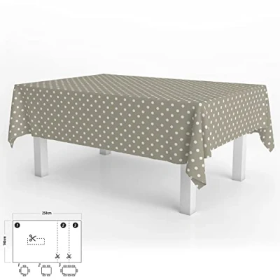 Oilcloth tablecloth printed in beige with white circles. Fashion and elegant design for any occasion. Dimensions: 140 x 250 cm. It can be easily cut or adjusted to any size, to fit any type of table, surface or craft. Protects table from splashes, spills, scratches and stains. It is waterproof and non-slipSturdy and durable, suitable for both outdoor and indoor use. Made from PVC and coated with soft felt on the back. Can be easily cleaned with a damp cloth. Not suitable for use in washing machine, dryer or iron. Ideal for tables in the living room, kitchen, dining room, terrace or garden. Perfect for protecting furniture, tables or surfaces, both inside and outside the home. Also known as oilcloth, stain-resistant oilcloth, stain-resistant tablecloth, stain-resistant tablecloth, kitchen tablecloth, protective tablecloth, table cover, table cover, kitchen oilcloth, etc.
