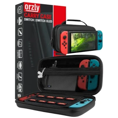 Designed for NINTENDO SWITCH | SWITCH OLED - Orzly Black Case made for Nintendo Switch & Switch OLED. It provides complete protection for your Switch or Switch OLED when travelling or in storage. The custom moulding ensures a snug fit that holds your Nintendo Switch and Joy-Cons securely, with or without a grip case. The microfibre screen cover protects the delicate screen from scratches while the plush microfibre lining cradles the body of your Switch. High-Grade Protection - Our switch case is feather light and designed to protect your Switch or Switch OLED from drops, bumps, scratches, and dust. The durable EVA outer shell is water-resistant, keeping your device protected from the elements. The soft inner lining gently cushions your Switch. The rubberised handle makes carrying easy for all hand sizes. Secure dual zips ensure the case won't open while being jostled and the hardy shell will protect from loose keys and cables at your Switch. Plenty of storage - The Orzly Nintendo Switch Case features secure storage for 8 Nintendo Switch games, at a glance, you can find the game you want to play next. Stow away your spare JoyCons, power bank, or charging cables inside the large elasticated pocket. The Orzly Carrying Case for Nintendo Switch & Switch OLED is part of a family of Nintendo Switch accessories designed to help you get the most from your console. Reviewed and highly rated by Wired Magazine, Gamespot & IGN, our Switch pouch is the premier choice for protecting your Nintendo Switch or Switch OLED. Orzly is a London Based Technology Accessories Consumer Brand and all our products are designed by a team of Passionate Consumer Tech Fans who take great pride in product design and development and also pay attention to the small details such as making sure our packaging concepts offer a great unboxing and giftable experience. We stand by the quality of our products and offer a one-year Replacement Warranty.