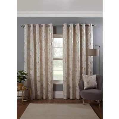 These beautiful and modern, fully lined and ready made natural eyelet ring top curtains will make any room shine with elegance. Featuring a stylish metallic Japanese tree pattern over a soft velvet fabric with an eyelet ring top header. Material - 100% polyester velvet. Care Instructions - Dry clean only. Contents - Pair of eyelet curtains (46" width x 54" drop).