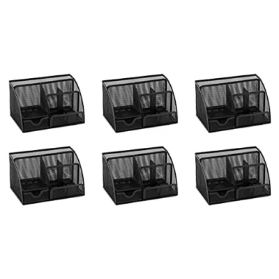 OSCO Black Wiremesh Desk Organiser with Drawer 6 pack Tidy Pen Holder Makeup Container Pencil Storage Compartments Stationery Caddy H13 x W22 D14 cm