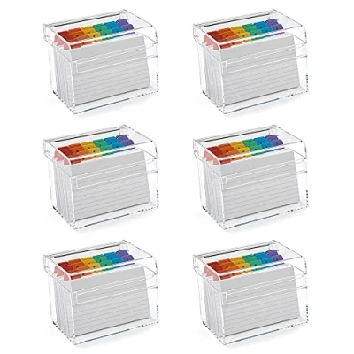 STYLISH AND FUNCTIONAL DESIGN: OSCO crystal-clear small acrylic index box features a slightly angled profile and cantilevered lid for enhanced visibility and quick access. Ideal for organising revision flashcards, recipe slips, contacts, and everyday notes at home, office, or classroom use. PREMIUM QUALITY MATERIALS: Crafted from thick, high-grade acrylic, this 6-pack index box includes 100 lined note cards and coloured A to Z divider tabs per box. Durable, stylish, and practical, perfect for home, office, or classroom organisation of notes, recipes, and contacts. COMPACT AND PRACTICAL DIMENSIONS: Measuring H98 x W136 x D95 mm and weighing 0.37 kg per box, this small acrylic index box fits neatly on desktops, shelves, or drawers while storing flashcards, recipe slips, or contacts efficiently. Multipack design allows convenient bulk storage across multiple areas. GREAT VALUE MULTIPACK SOLUTION: This 6-pack offers cost-effective organisation for multiple areas, classrooms, or home office use. Keep your workspace fully stocked with OSCO clear acrylic index boxes, ensuring easy access, full visibility, and practical storage for everyday notes, flashcards, and recipe slips. TRUSTED UK BRAND WITH EXPERIENCE: OSCO is a UK-based company supplying high street and online retailers across the UK and Europe for over 25 years. Renowned for quality, innovation, and timeless design, OSCO delivers reliable, stylish stationery solutions for home, school, and office organisation.