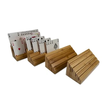 OSCO Playing Card Holders Set of 4, Natural Sustainable Bamboo Deck Organiser Tray for Poker, Bridge, Rummy & Board Games, Hands Free Cards Rack Adults Kids, Tabletop Accessory