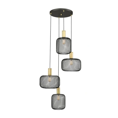 Round lamp of 4 lights made of metal. Includes 2 designs of metal mesh shades. Matt black and gold paint finish. Sheathed black textile cable.