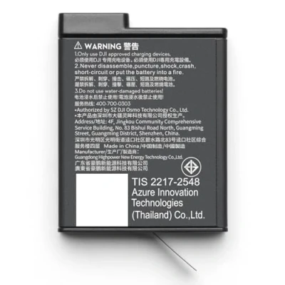 This high-capacity 1950mAh battery is designed to withstand low temperatures and reliably operate in environments ranging from -20° to 45° C. Compatibility:Osmo Action 6 , Osmo 360, Osmo Action 5 Pro, Osmo Action 4, Osmo Action 3 Tips: Compatible only with the Osmo Action Multifunctional Battery Case 2, not compatible with the Osmo Action Multifunctional Battery Case. Specifications: Capacity: 1950 mAh, Operating Temperature: -20° to 45° C Specifications: Weight: 34 g, Dimensions: 44.2×34.4×12.1 mm (L×W×H)